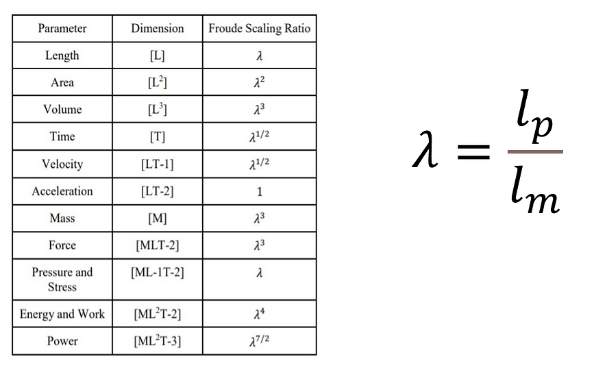 Tomando los valores de λ = lp / lm especificados en la tabla a continuación, para cada una de las variables de interés, se realiza la estimación de los valores de resistencia ejercida por el bote a escala y la potencia demandada por la misma. Los datos para el proceso de escalado se tomaron de los resultados obtenidos para el CAT1IT7 por el equipo de diseño de ENERGÉTICA 2030.